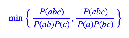 因此,本文就是在前文的基礎上改進,那里只考慮了相鄰字的凝固度,這里同時考慮多字的內部的凝固度(ngrams),比如,定義三字的字符串內部凝固度為: