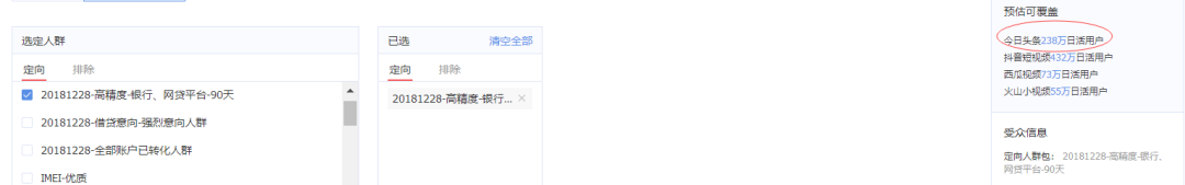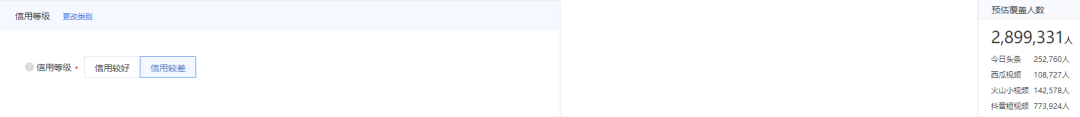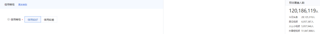 信用較好+信用較差合起來是1.2億人,遠沒達到頭條全部用戶。有一部分人群“沒有信用標記”,所以我們可以同時使用定向“信用較好”和排除“信用較差”。