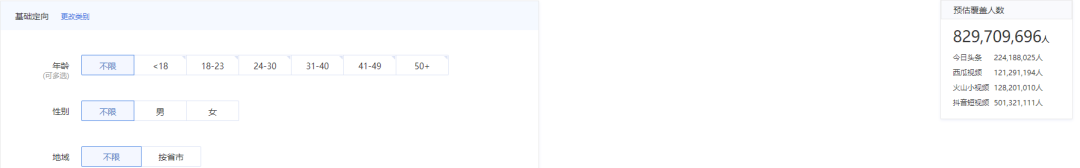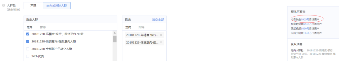 提示:這幾個人群包可以單獨用,也可以合在一起用。但是要看一下預估人群范圍:如果過小(小於百萬級就是過小)會很難花錢,最好和別的人群包一起使用;如果大於1個億參考意義就很弱了,包太大了、要分開使用。