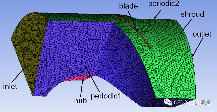 由於葉輪具有周期性,考慮節省計算資源,葉輪內部流場計算采用單流道周期性邊界模型,在ICEM CFD中划分網格。將模型邊界分別命名為進口inlet、出口outlet、輪轂面hub,機匣面shroud,周期性邊界periodic,葉片blade,如圖2所示。將ICEM CFD划分完成的網格導出,存為axis-pump.msh文件。