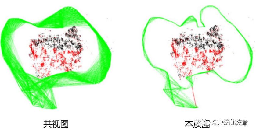 下圖展示了共視圖和本質圖的區別所在,邊的減少可以降低位姿圖優化的負擔。