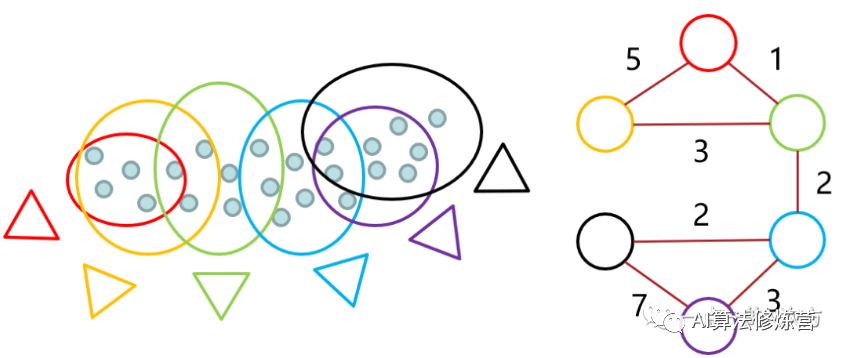 於是就可以得到右邊的圖結構,紅黃之間邊的權重為5,紅綠權重為1,黃綠權重為3等等。