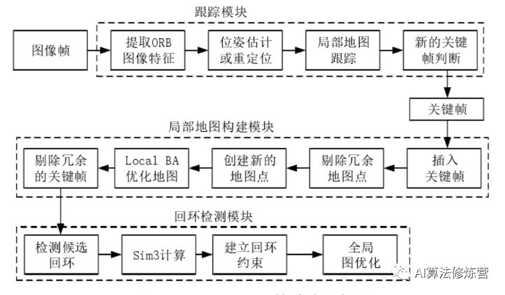 ORB-SLAM算法和PTAM具有相同的算法框架,采用多線程構架,四個主線程:前端位姿跟蹤、局部地圖構建與優化、閉環檢測與優化、顯示與交互。