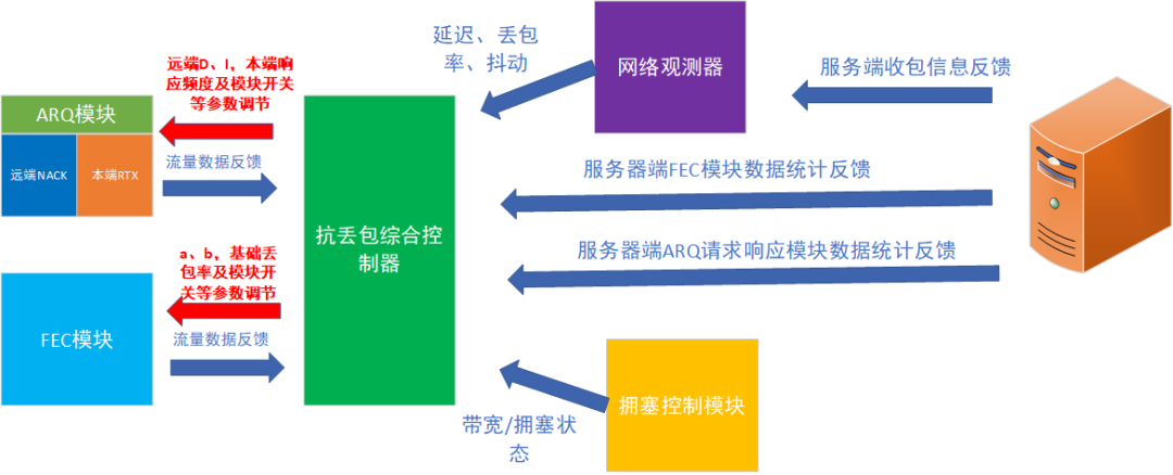 服務器作為接收端會建立抗丟包效果評估模塊,具體到指標有NACK成功率,NACK響應時長,FEC 成功率等。發送端會基於此類的反饋,以及兩個模塊自身的相關統計數據,如Rtx(重傳包)、FEC流量與原始信源的流量占比,以及擁塞控制模塊的擁塞狀態等,進行模塊內策略相關的參數(D、I、a、b等)的動態的調整。