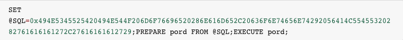 把下划線給過濾掉了,那這種在多語句下,可以利用mysql的預查詢來繞過,值得注意的是,這個版本語法大小寫敏感。