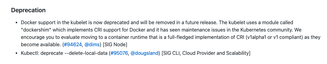 - Kubelet 中對 Docker 支持被棄用,並將在以后的版本中刪除。Kubelet 使用一個名為