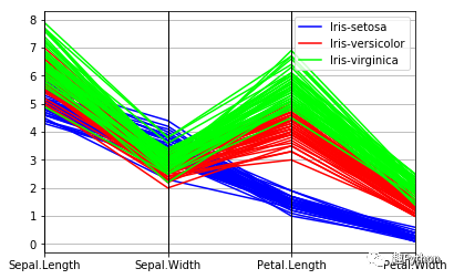# 平行坐標可以看到數據中的類別以及從視覺上估計其他的統計量。