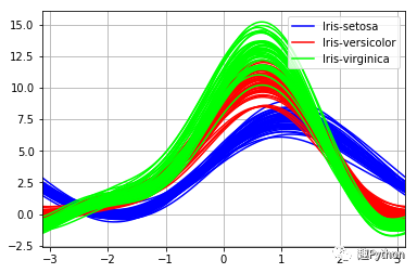 # Andrews曲線將每個樣本的屬性值轉化為傅里葉序列的系數來創建曲線。