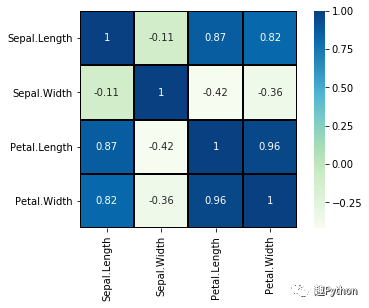 sea.heatmap(iris.corr(), annot=True, cmap='GnBu', linewidths=1, linecolor='k',square=True)