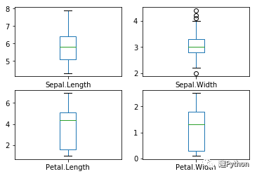 iris.plot(kind='box', subplots=True, layout=(2,2), sharex=False, sharey=False)